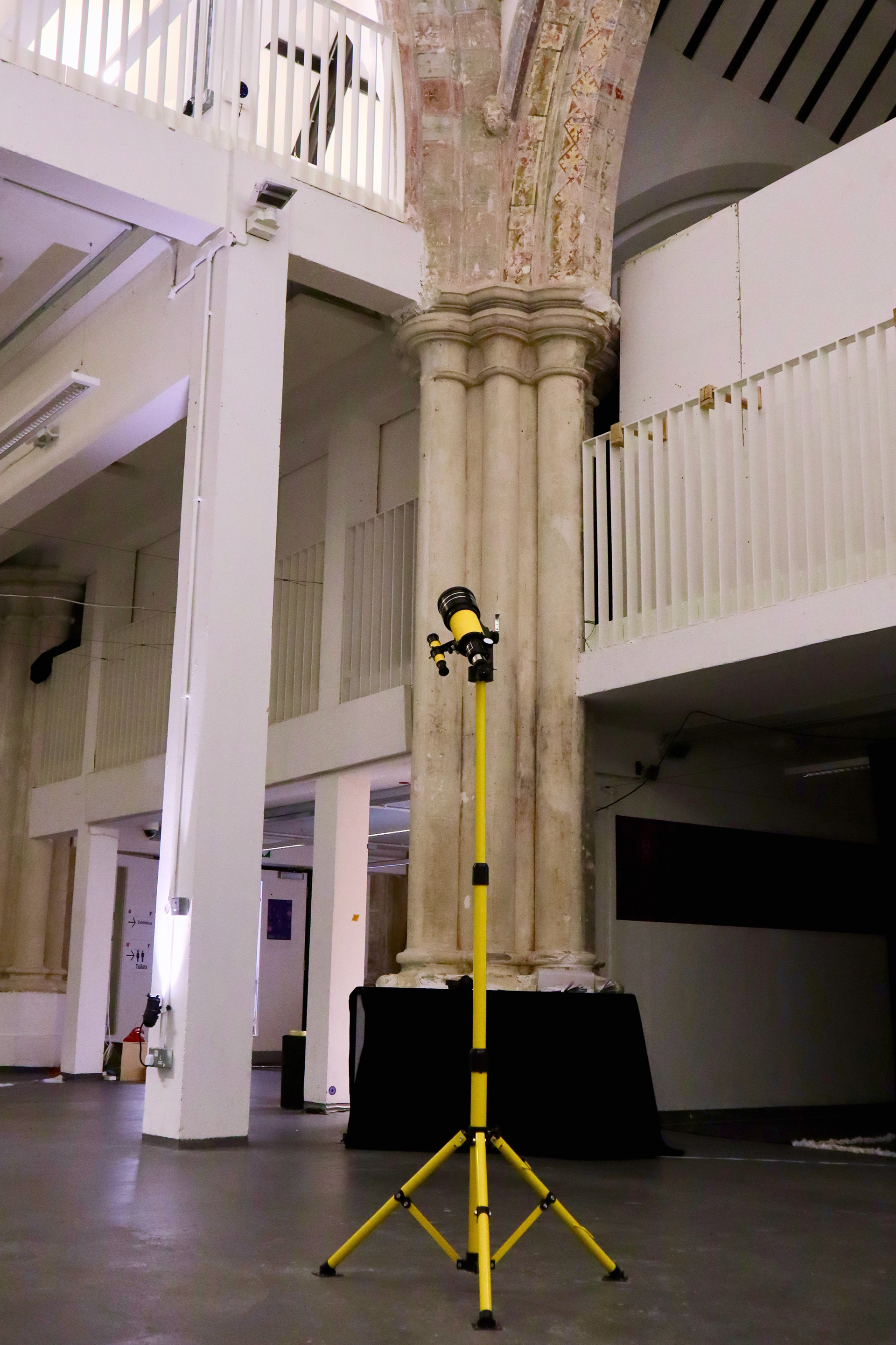 Concrete Constellations is an interactive sculpture where viewers are invited to peer through a telescope and observe dynamic typography as it floats across the 'sky’ in the form of zodiac constellations. The telescope is used as a mediator for the spectacle, pointing at a Raspberry Pi screen mounted on the floor above. These textual constellations pay tribute to a 1950s Concrete Art method of writing tokened ‘Concrete Poetry’. More specifically, this piece is an ode to founder, Eugen Gomringer's, 1954 Manifesto, 'From Line to Constellation', in both the textual constellations’ form, as well as their delivery. These zodiac constellations are generated on Processing using JSON data from a Word Associations API and plotted across a digital solar scape.